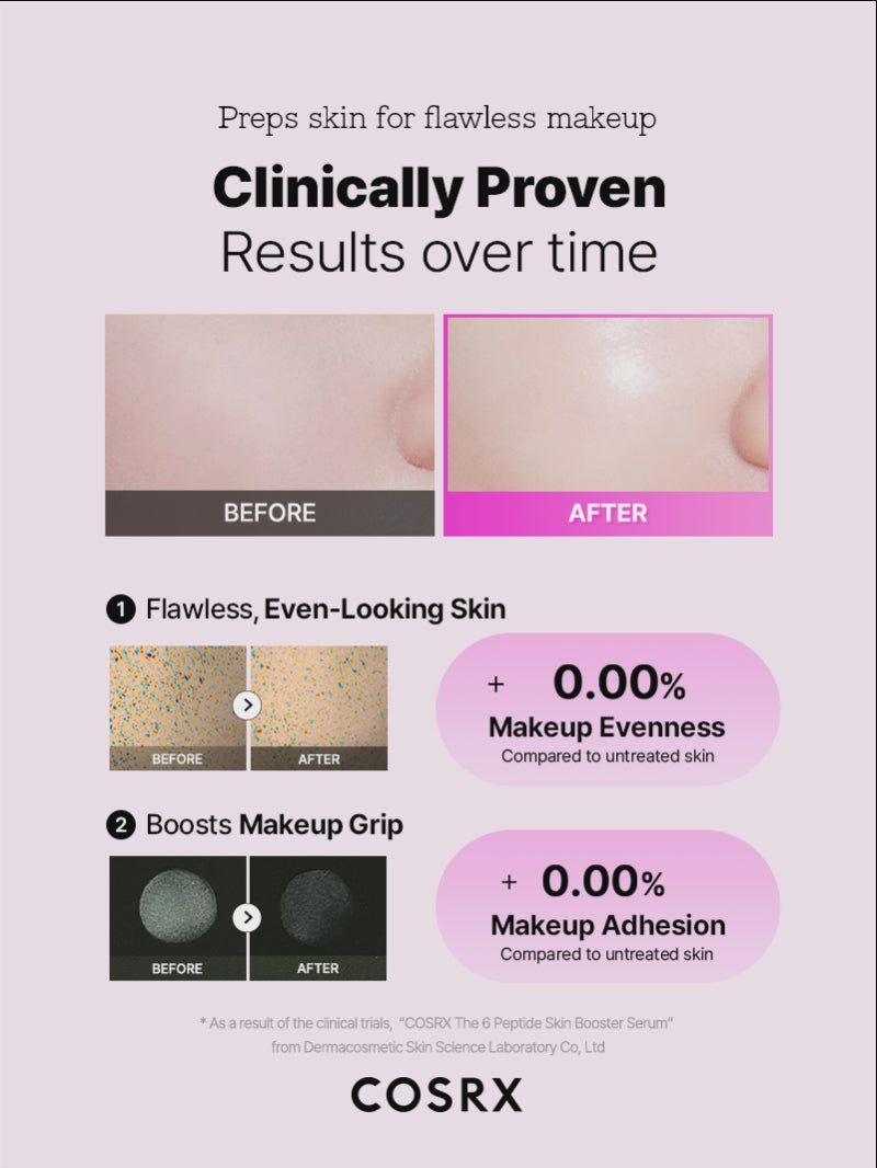 COSRX The 6 Peptide Skin Booster Serum works as the first step after cleansing to prep and awaken the skin. Its six multi-peptides, hyaluronic acid, and amino acids help improve texture, firmness, and hydration. It enhances the effects of subsequent products, making it an ideal all-in-one base for any skincare routine.